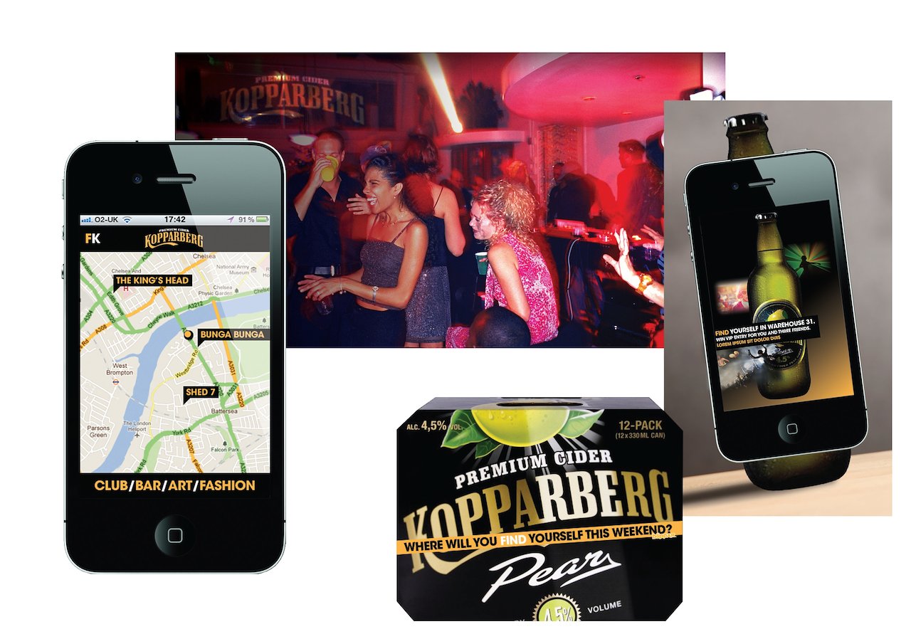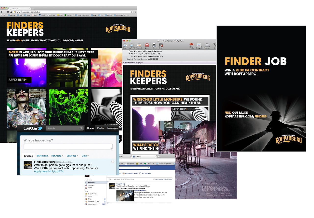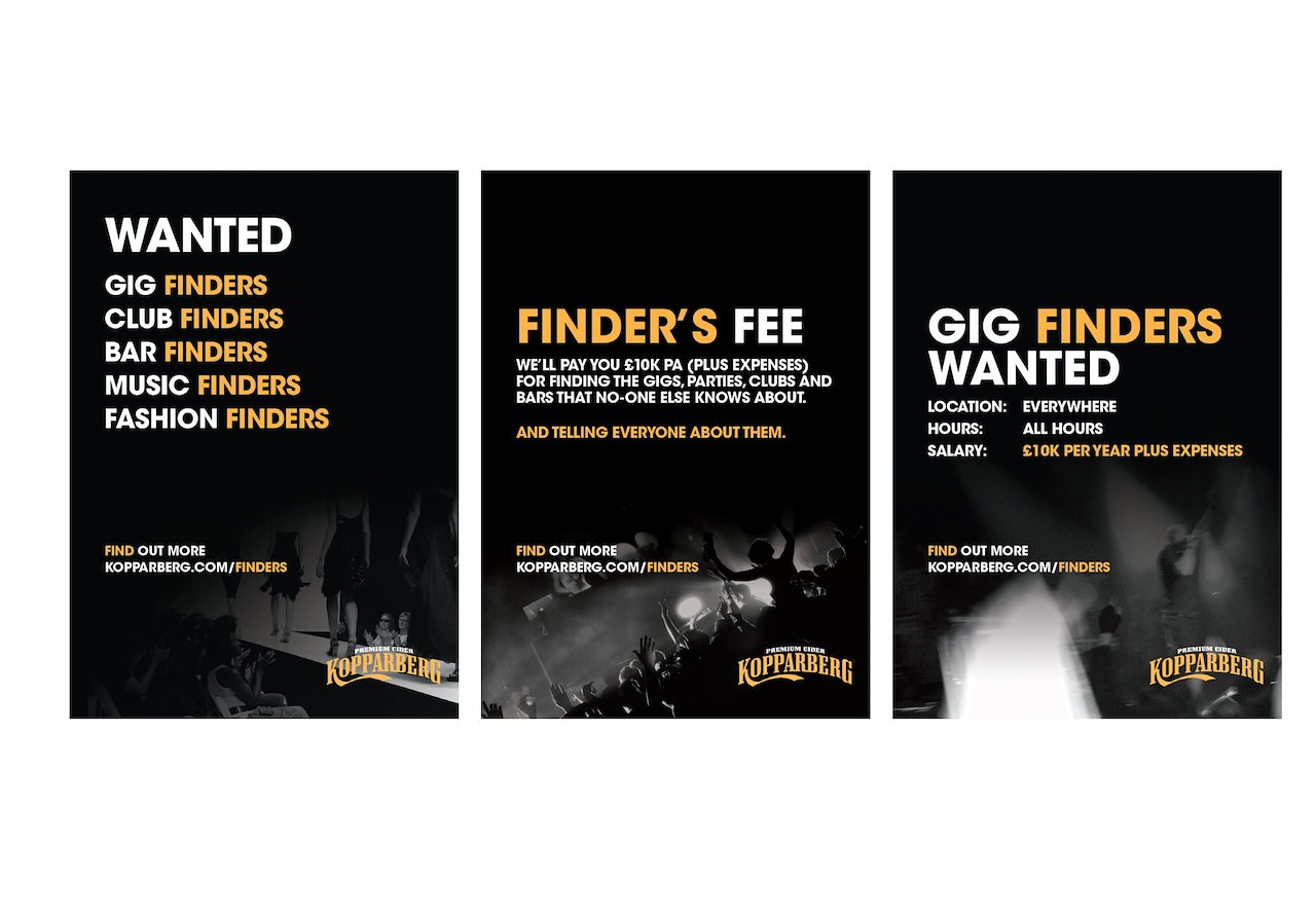 A nice bit of spec work for Kopparberg – the Swedish cider that wants to be seen as the drink for the unconventional and the underground. The challenge? Market it on a relative shoestring. (Not literally. That would be silly.) Our solution was to employ a select few influencers as “Finders” – people who’d find the latest bars, scenes, artists, bands and happenings before anyone else did. Then blog about it. But we’d actually pay them £10k pa to do it. Plus all the cider they could drink. They’d get talking, which would get everyone talking and we’d house it all on our little social hub. The drink becomes part of the scene. Cheers.