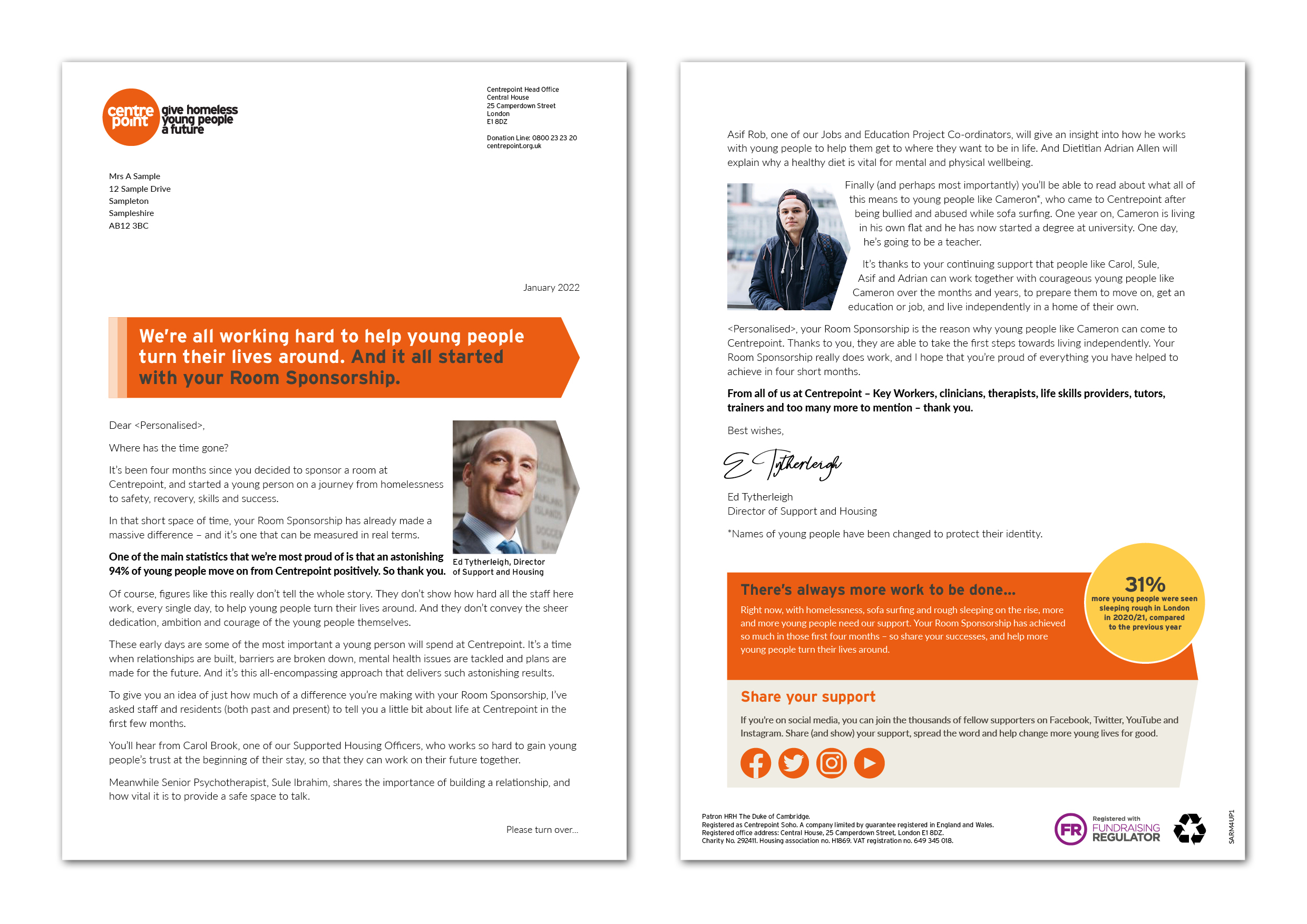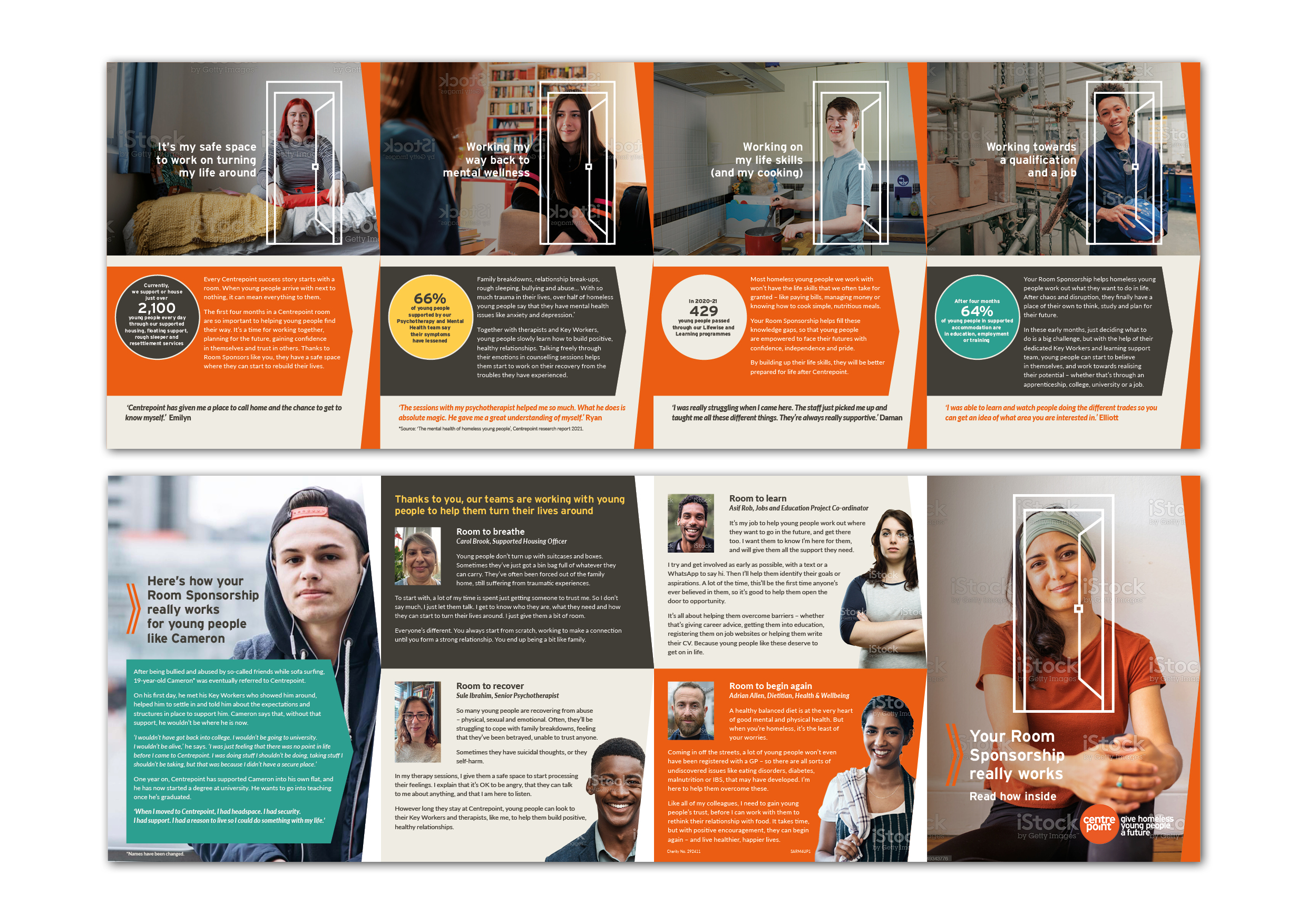 This four month update for Centrepoint room sponsors was created to show how sponsorship is a long-term project, yielding, long-lasting results. At the same time, we wanted to dramatise just how much had already been achieved in four short months.